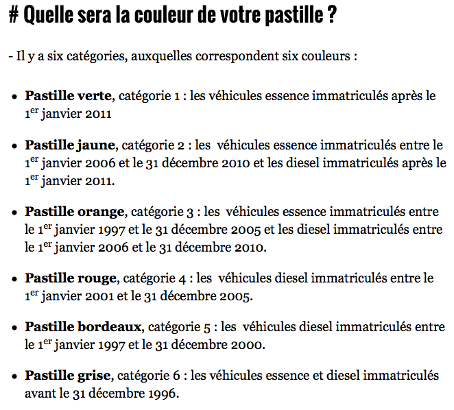 On distingue 6 classes destinées aux véhicules les plus propres. La nomenclature s’appuie sur les émissions polluantes des voitures particulières, des 2- 3 roues et quadricycles, des poids lourds, dont les autobus. Elle comporte 6 classes en fonction de la motorisation et de l’âge du véhicule, dont une classe spécifique est réservée aux véhicules électriques « zéro émission moteur ».