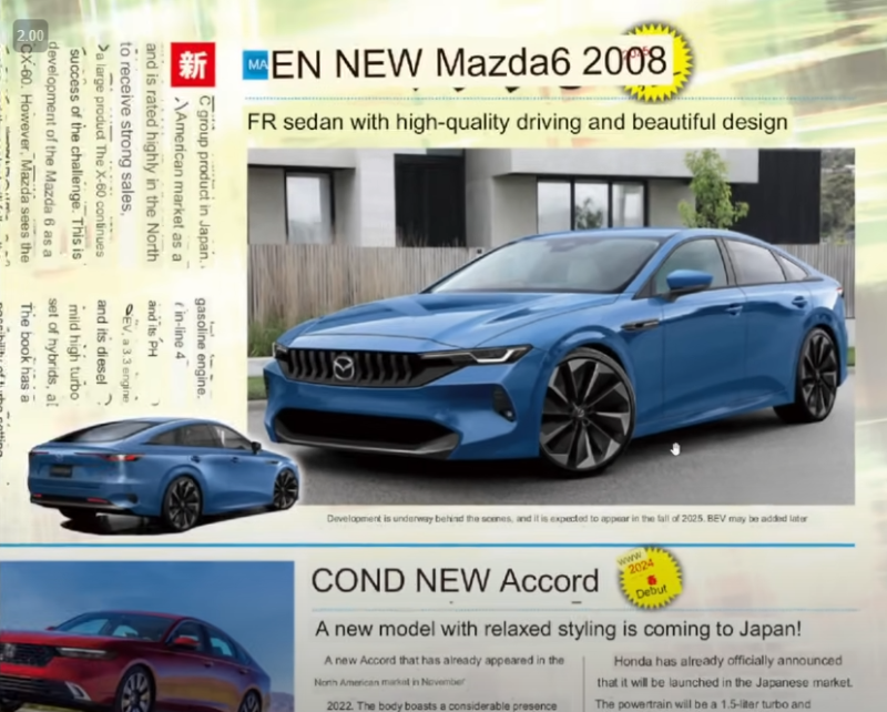 Alors ce qui suit c'est à prendre avec d'énormes pincettes, mais récemment une vidéo que je regardais d'un youtubeur qui commentait l'actualité des prochains modèles venus tout droit du Japon, il y avait une image de la Mazda 6. A priori Mazda ferait un dernier modèle pour la route, sorte de baroud d’honneur, en réutilisant à priori la base du CX-60 et à causes des futures nouvelles normes drastiques en d'anti pollution, ça serait une PHEV et une ligne très aérodynamique.