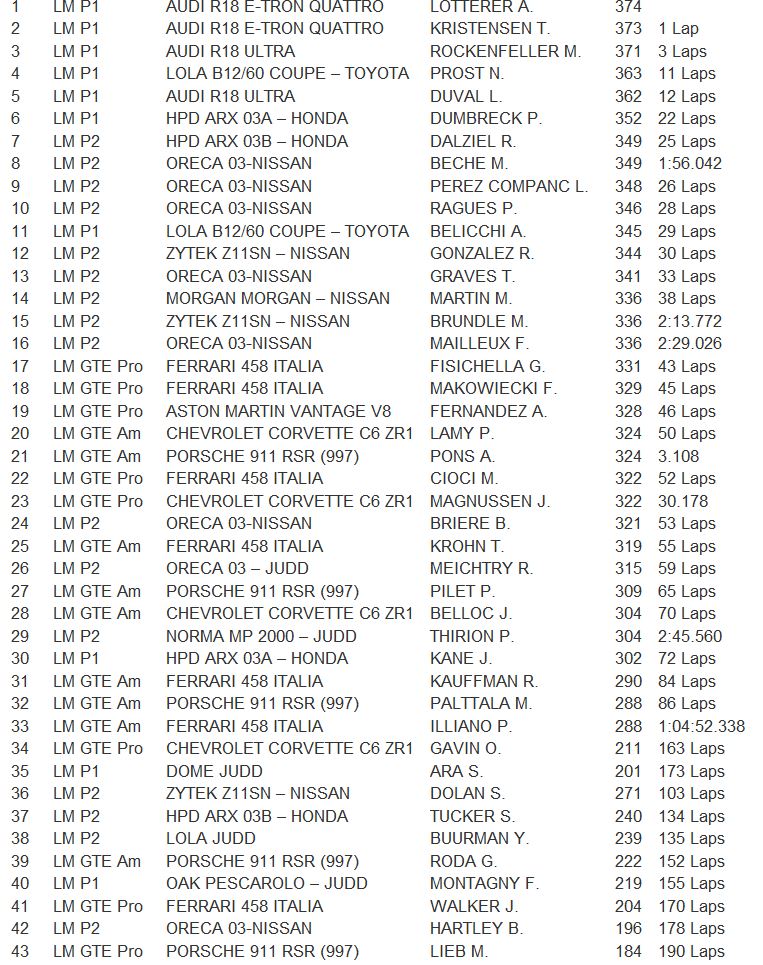 Hélas, l'abandon de la Nissan DeltaWing pilotée par Marino Franchitti, Michael Krumm et Satoshi Motoyama a été officiellement notifié à 22h57, à la suite de l'accrochage avec la Toyota TS030 Hybrid n°7 de Kazuki Nakajima.