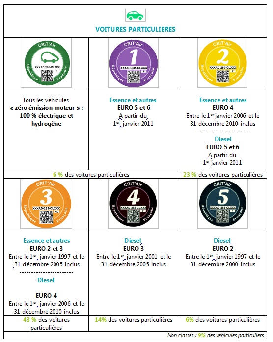 On distingue 6 classes destinées aux véhicules les plus propres. La nomenclature s’appuie sur les émissions polluantes des voitures particulières, des 2- 3 roues et quadricycles, des poids lourds, dont les autobus. Elle comporte 6 classes en fonction de la motorisation et de l’âge du véhicule, dont une classe spécifique est réservée aux véhicules électriques « zéro émission moteur ».